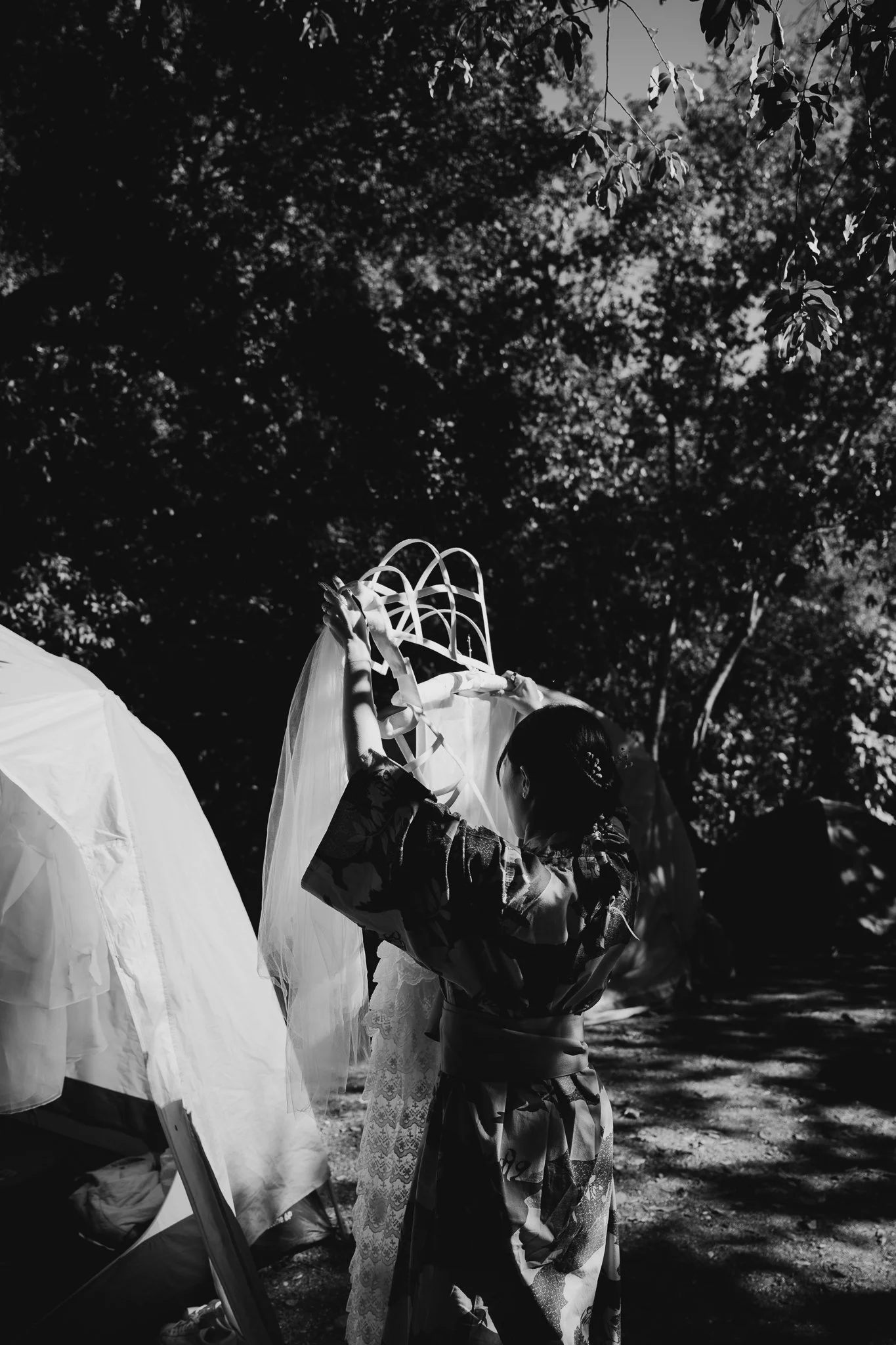 11 -11:45 : capturing getting ready at tree bones outside the yurt, have coffee together, write down your vows. First outfit, with swim suit packed